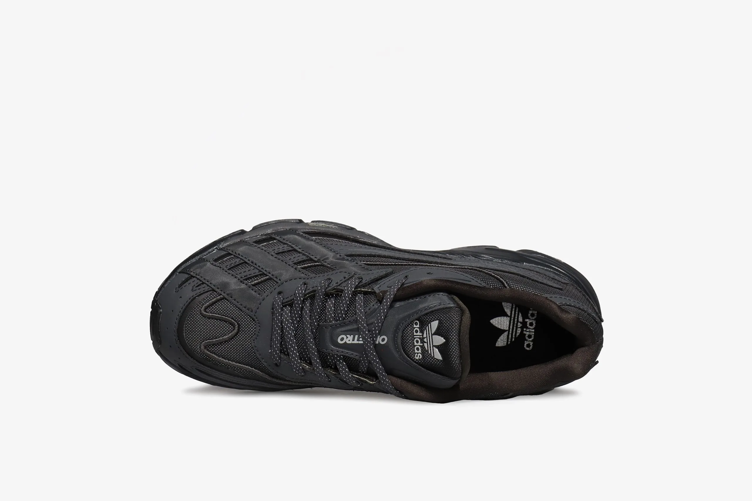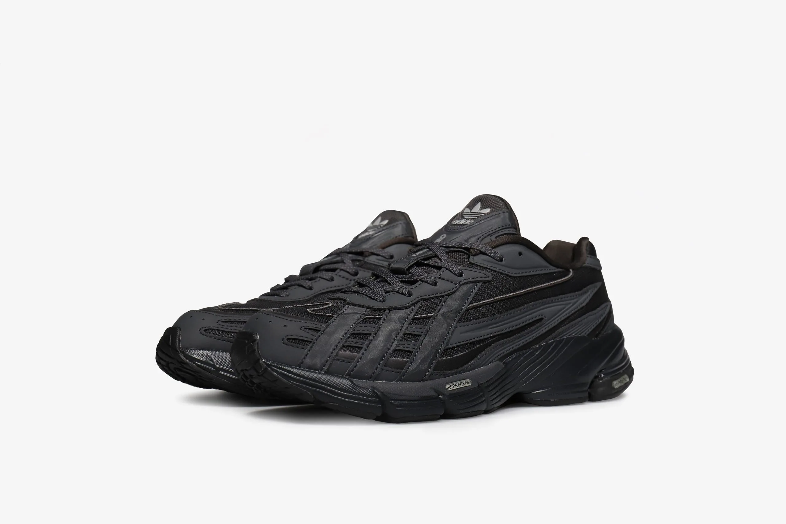 The Orketro Shoes look to lightweight ’90s running shoes and brutalism for design inspiration. This confluence of references combines to push the classic running silhouette in a new, futuristic direction. The asymmetrical design is crafted from a mix of mesh and suede with metallic leather details and rests on a premium rubber outsole. The shoes are signed off with Trefoil and Orketro branding on the tongue.
