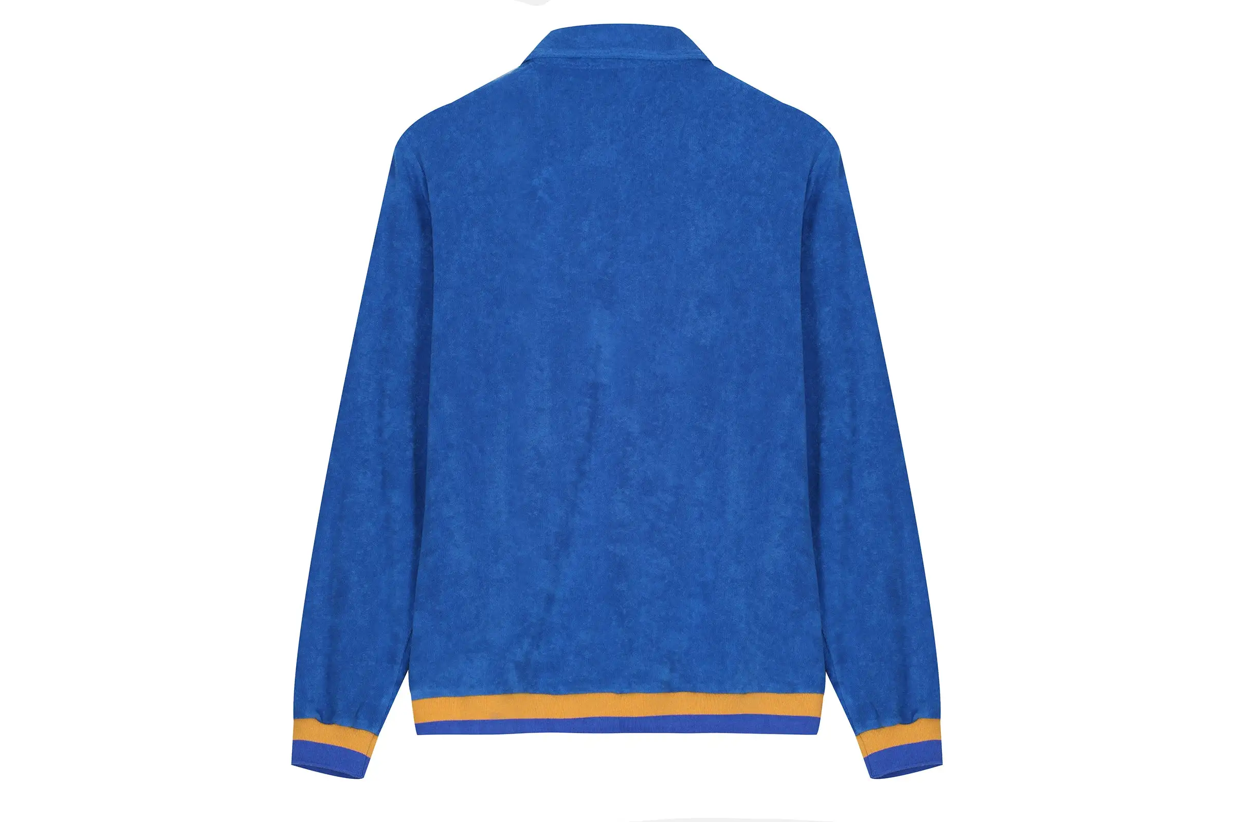 Anglozine’s neighbourhood Bethnal Green was deserted when they started to put season 6 together back in March 2020. Marooned in a locked-down area daydreams about J.G.Ballards imagined tropical London desert served as a centrepiece to this seasons collection. Here we a new style for SS21 in the shape of the Cody Towelling track jacket, constructed from soft Terry cloth with a contrasting golden yellow cuff & hem.
