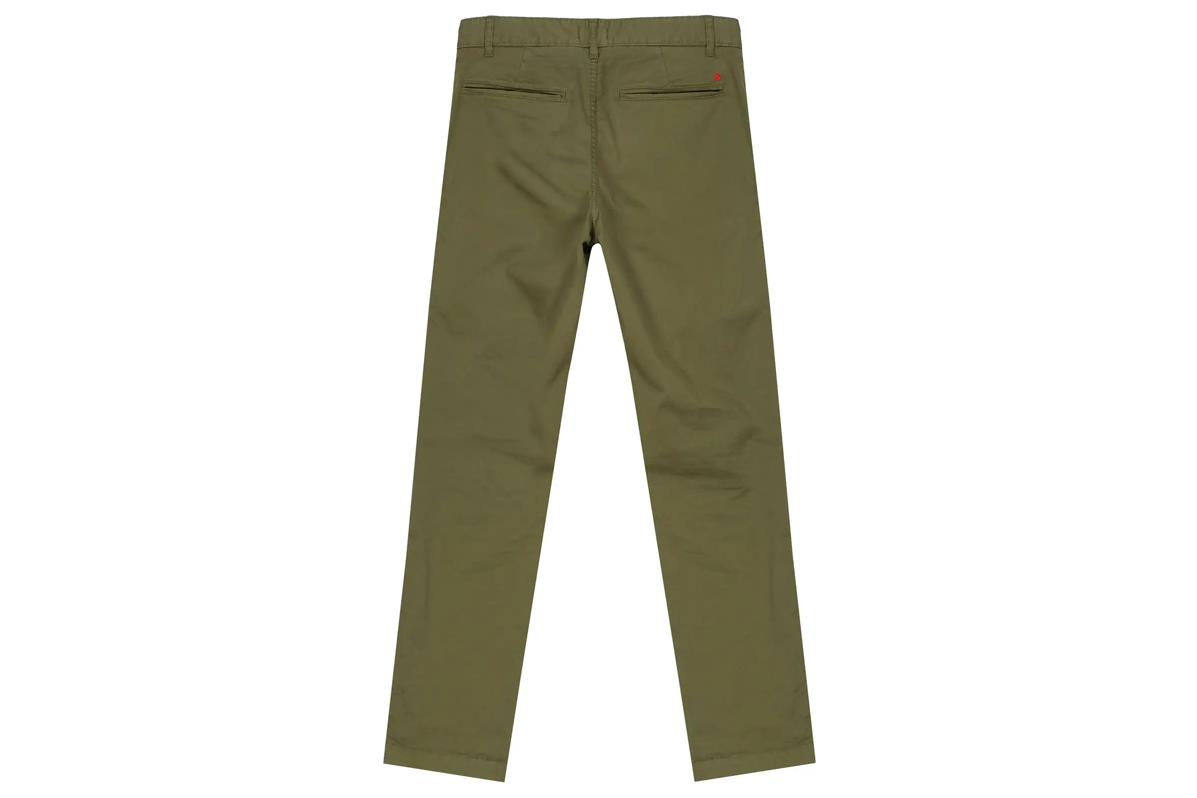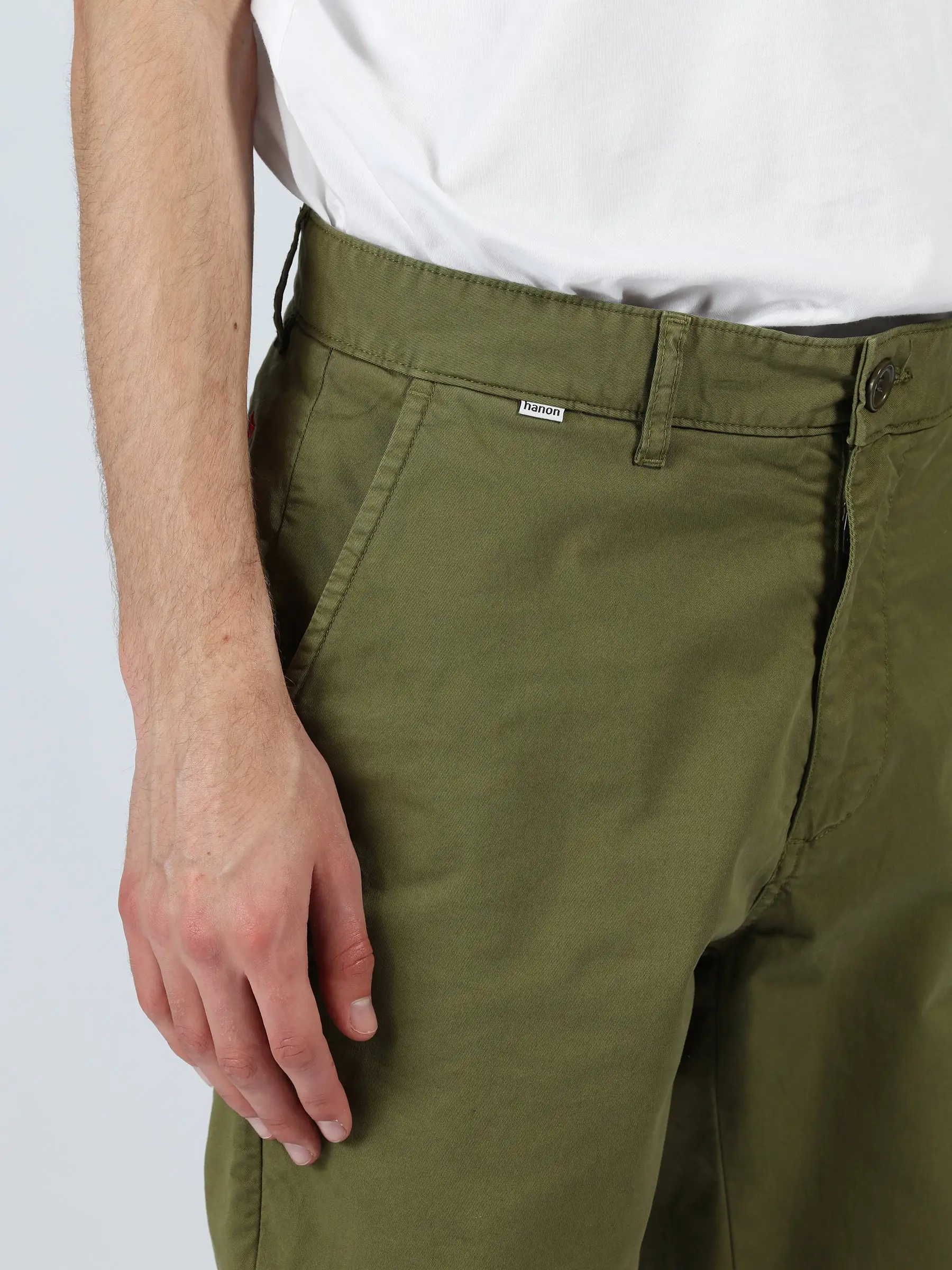 The HANON Billy Chino in Avocado Green is crafted in Portugal using 240gr garment dyed cotton twill and features double side entry pockets, woven flag label, single welt rear pockets, flame embroidery, YKK zip fly, and a concealed zip side pocket.