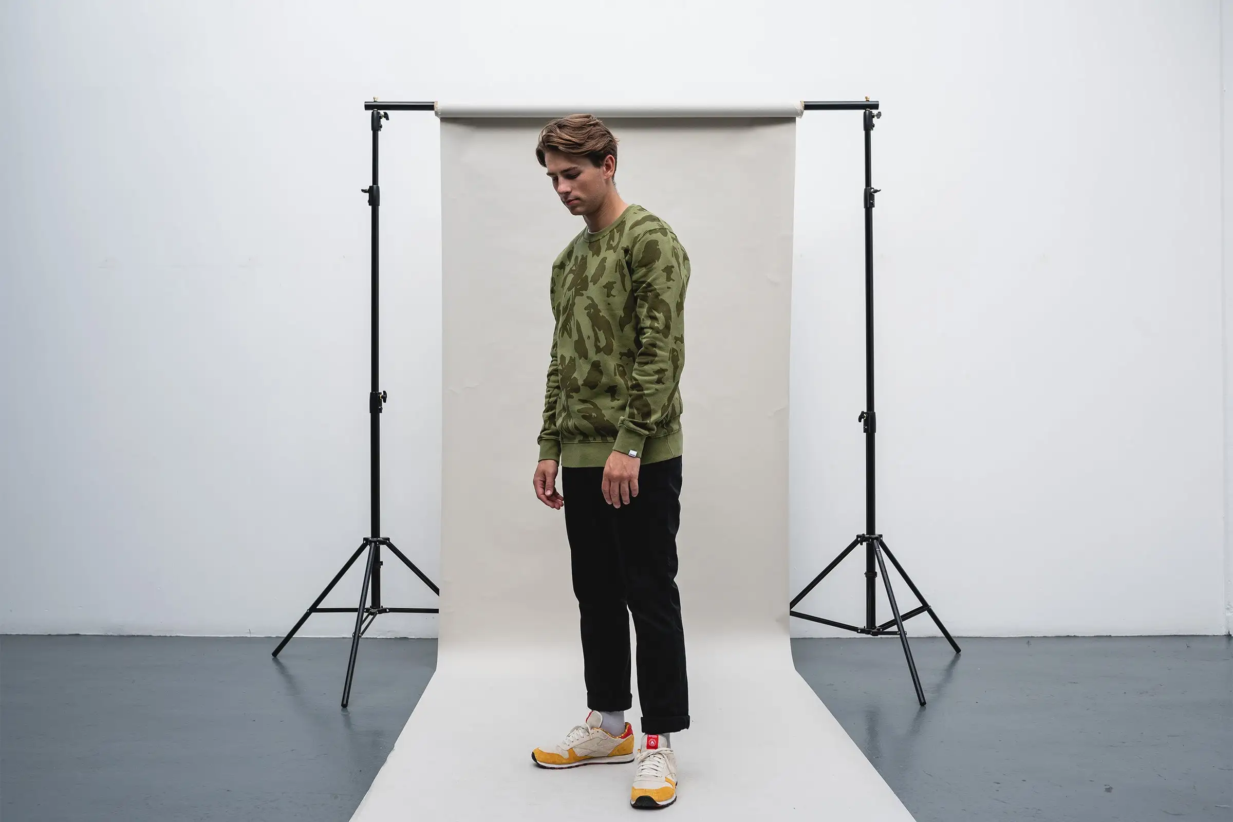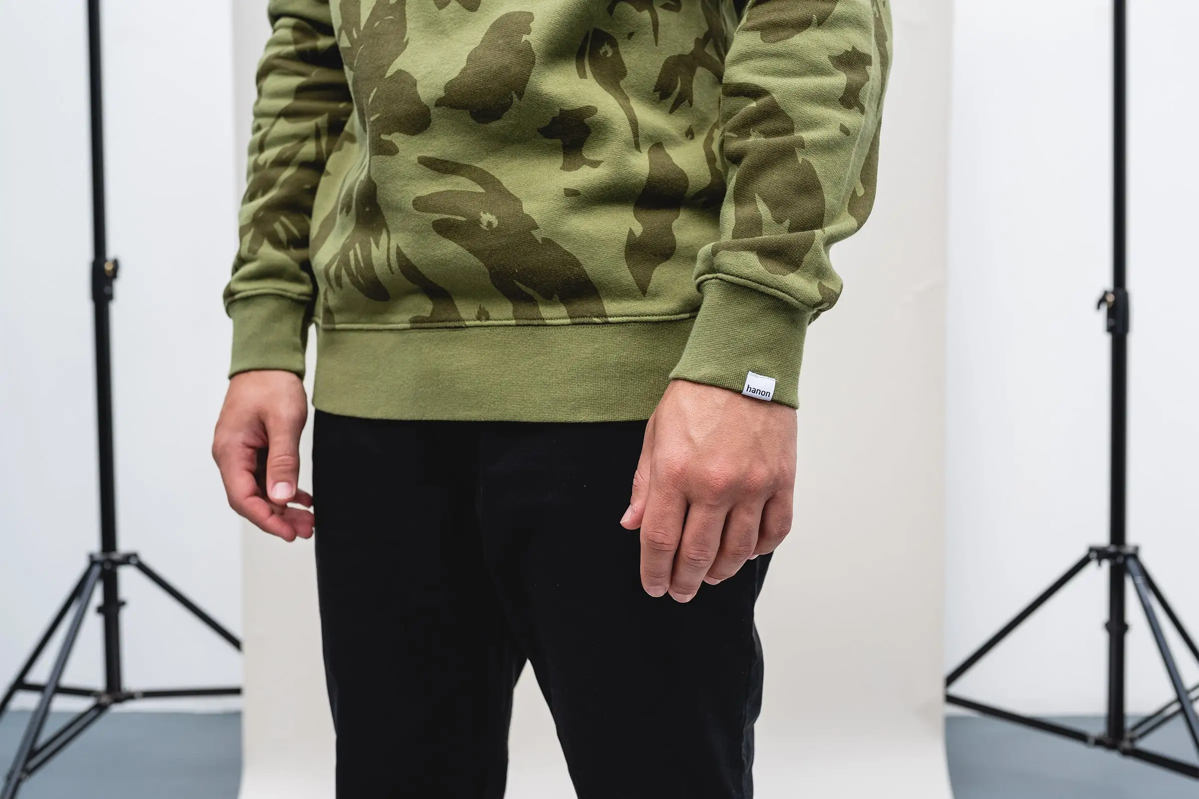 For Autumn/Winter ’18 our HANON collection returns, comprised of staples such as the Flame Badge series across t-shirts, sweats and hoods. Our Woven Shirt program also makes a welcome return with a distinctly autumnal palette, as well as a new range of graphics offered on a fresh selection of colours for the season. Here we have the Camo print sweatshirt finished in Military Green complete with woven HANON tab on the bottom right side.