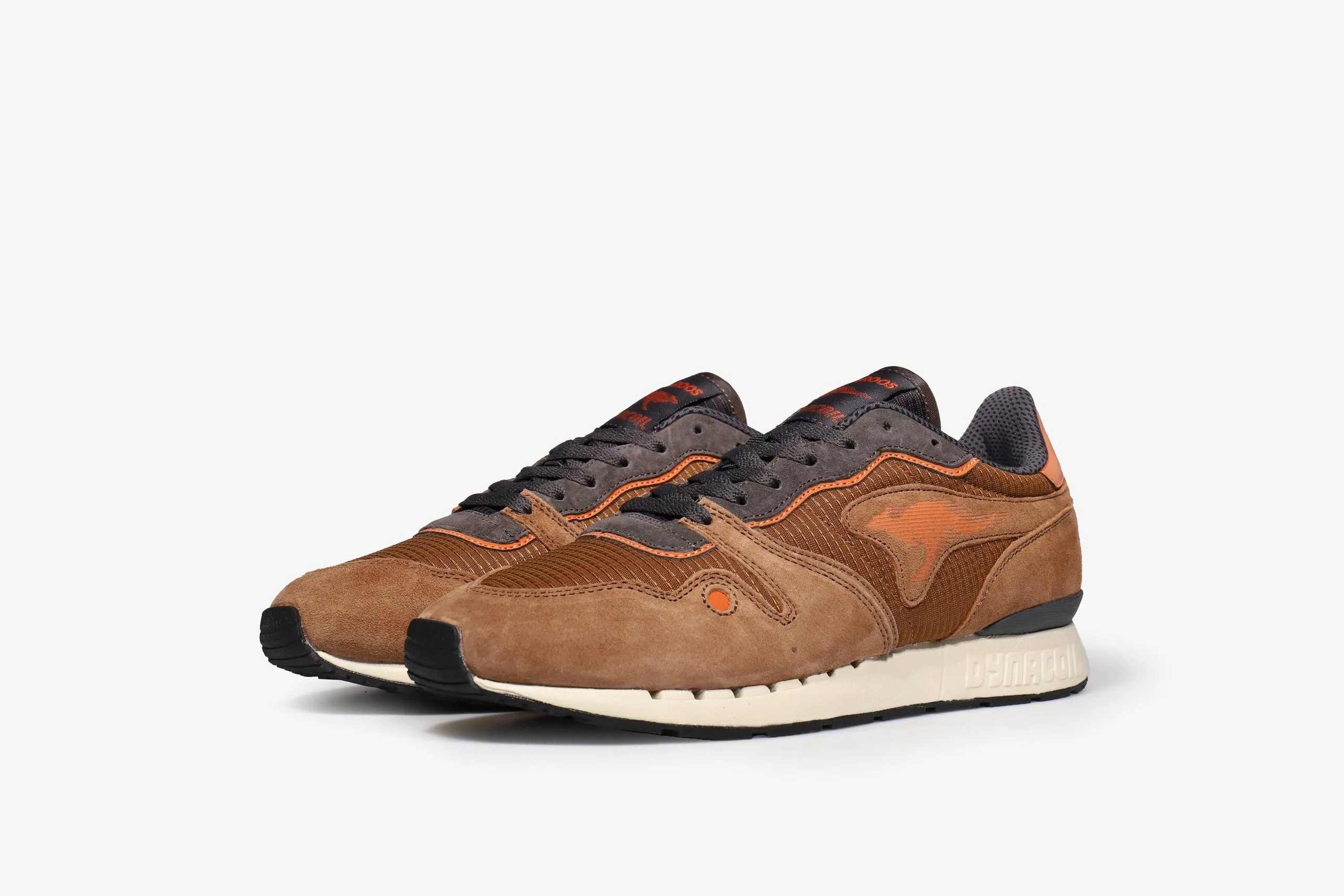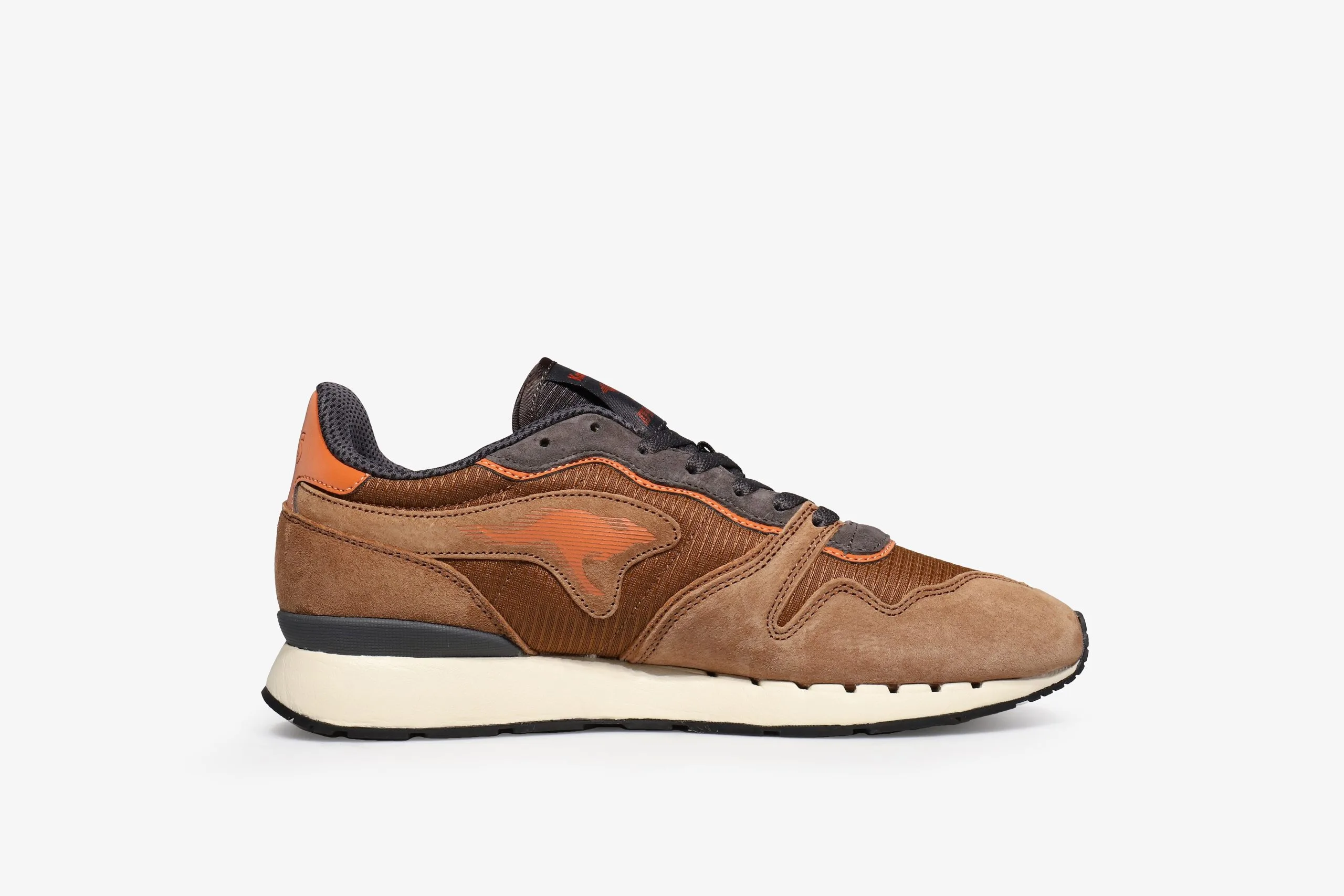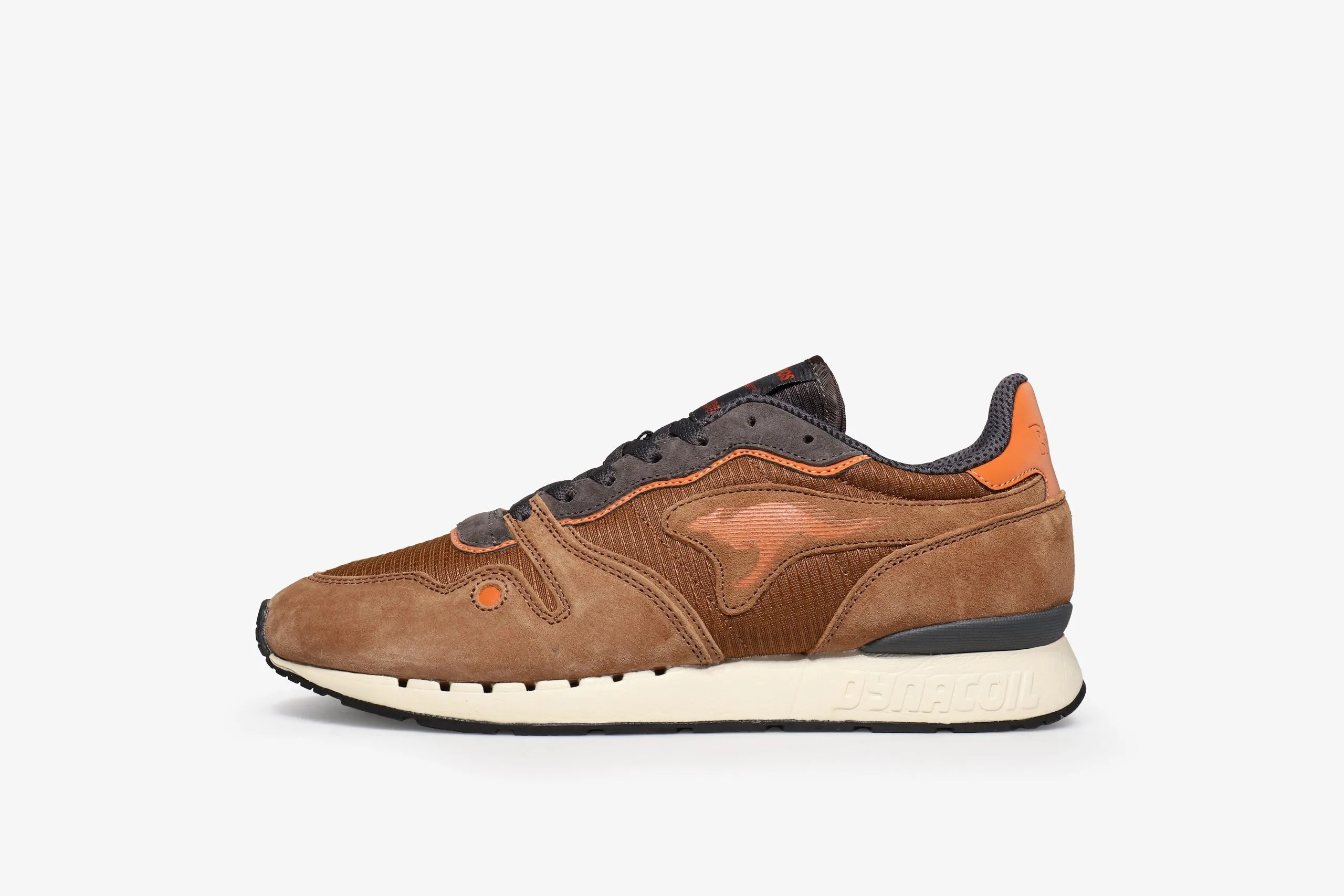 The Coil RX returns from deep within the KangaROOS archive to prove it’s comfort, durability and style deserved a come back. The durable nylon & suede upper on this pair feature a brown and grey colourway with orange leather accents that enrich the texture and provide a welcome pop of colour. Below foot the DYNACOIL cushioning system provides maximum comfort al day long. Finished in true KangaROOS fashion with a secret stash pocket behind the tongue.