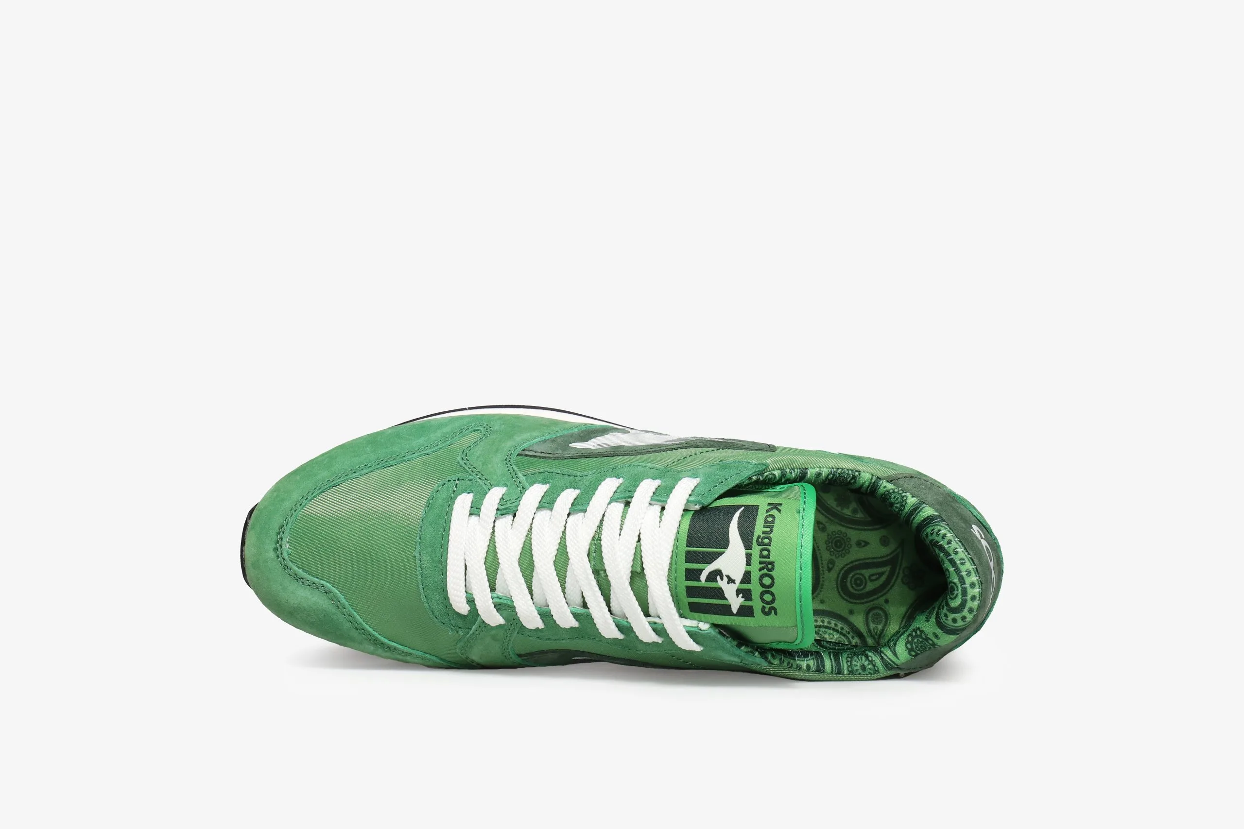 The KangaROOS Rally receives a vibrant make-over this season complete with a paisley bandana print interior. The nylon and suede upper comes dressed in a green/grey combo that keeps things clean & simple. The nylon tongue is finished with a woven label and secret interior pocket. A breathable Ortholite insole pairs with a EVA midsole for total all-day comfort.  Â