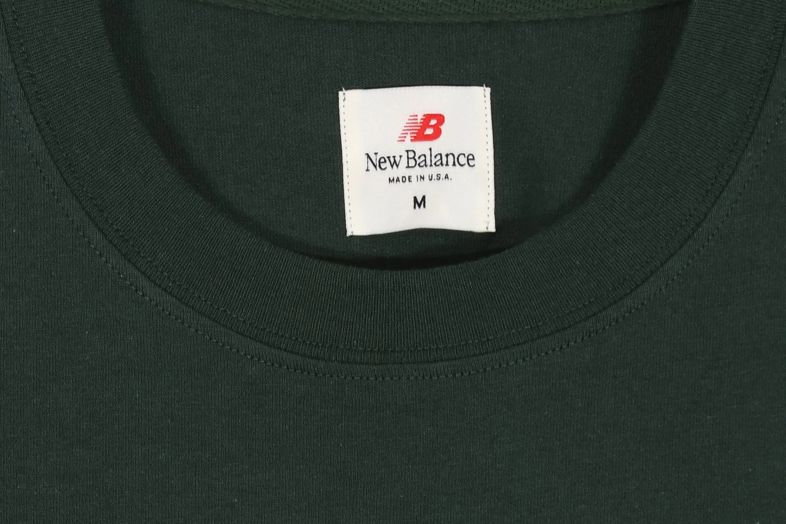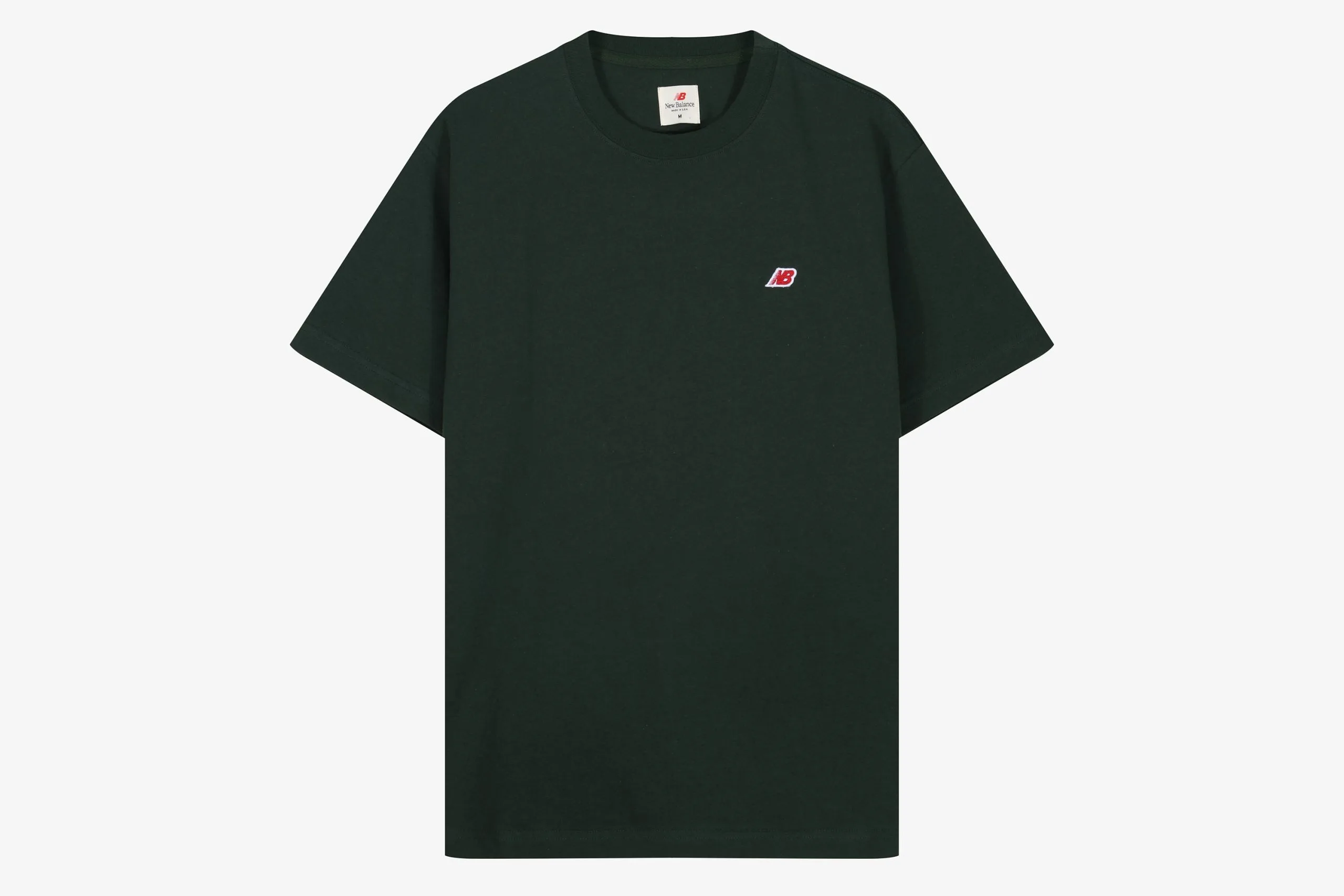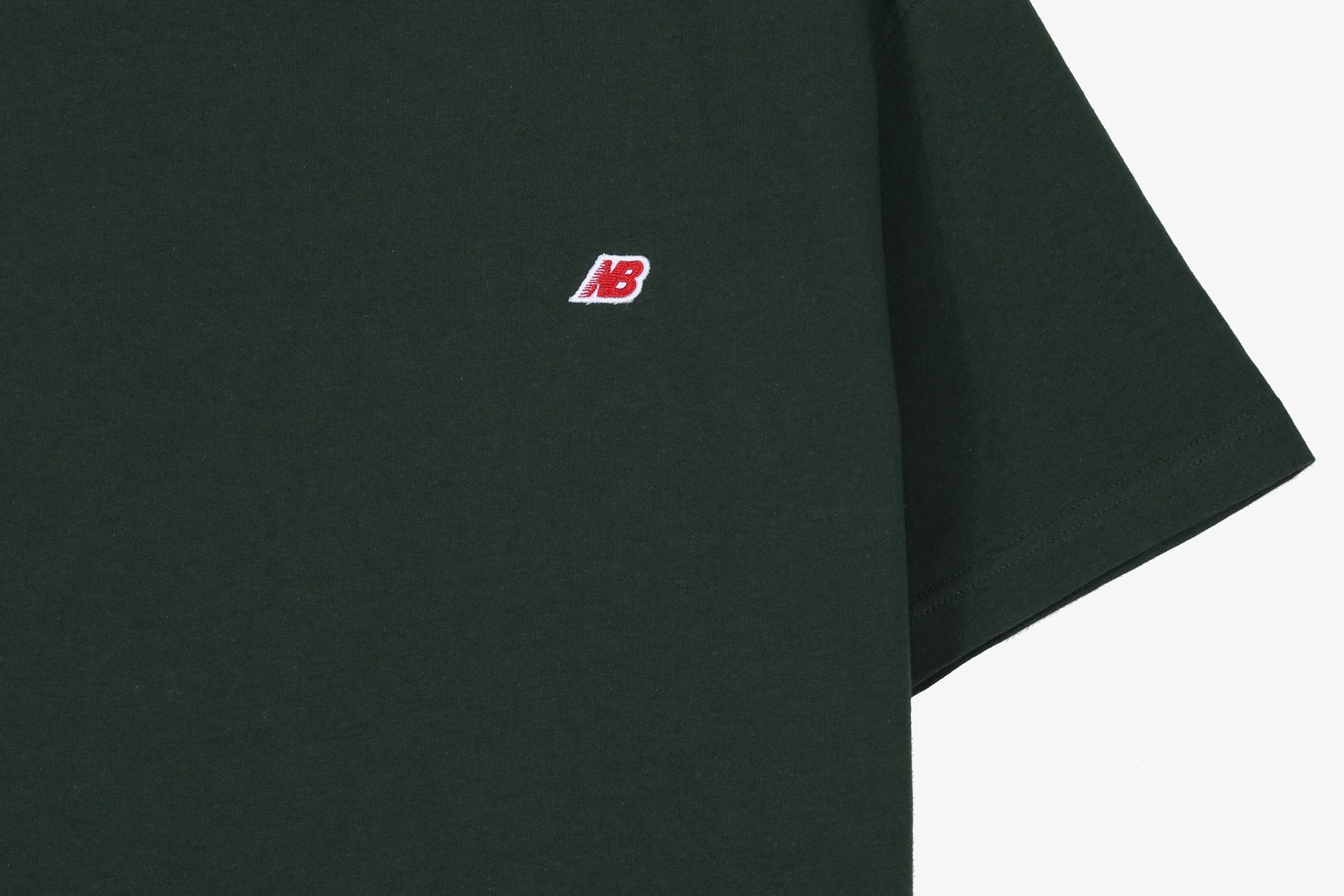 Here we have a uniform staple short sleeve tee constructed from 100% cotton in the USA. A New Balance NB logo embroidered patch appears on the left-hand side of the chest.