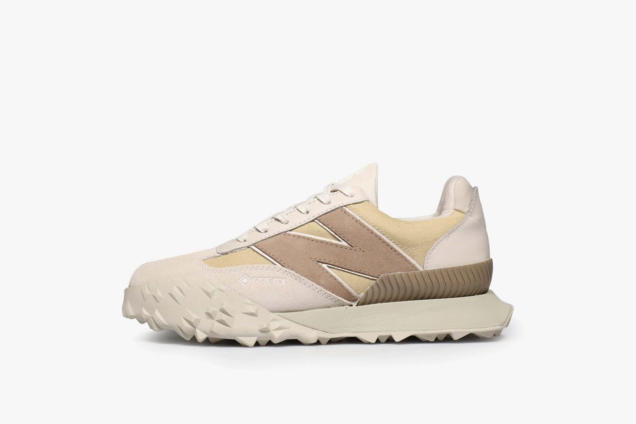 An updated twist on a 1970s archive-inspired design, the UXC72GCG athletic shoe is loaded with contemporary style. Fast becoming a very popular silhouette, this pair features a nylon & suede upper that is paired with a GORE-TEX membrane for top of the range protection against the elements. A unique outsole tread works with the exaggerated form to create a sleek and streamlined shoe. The bold “N” branding provides these shoes with a retro vibe and classic look that’s here to stay.