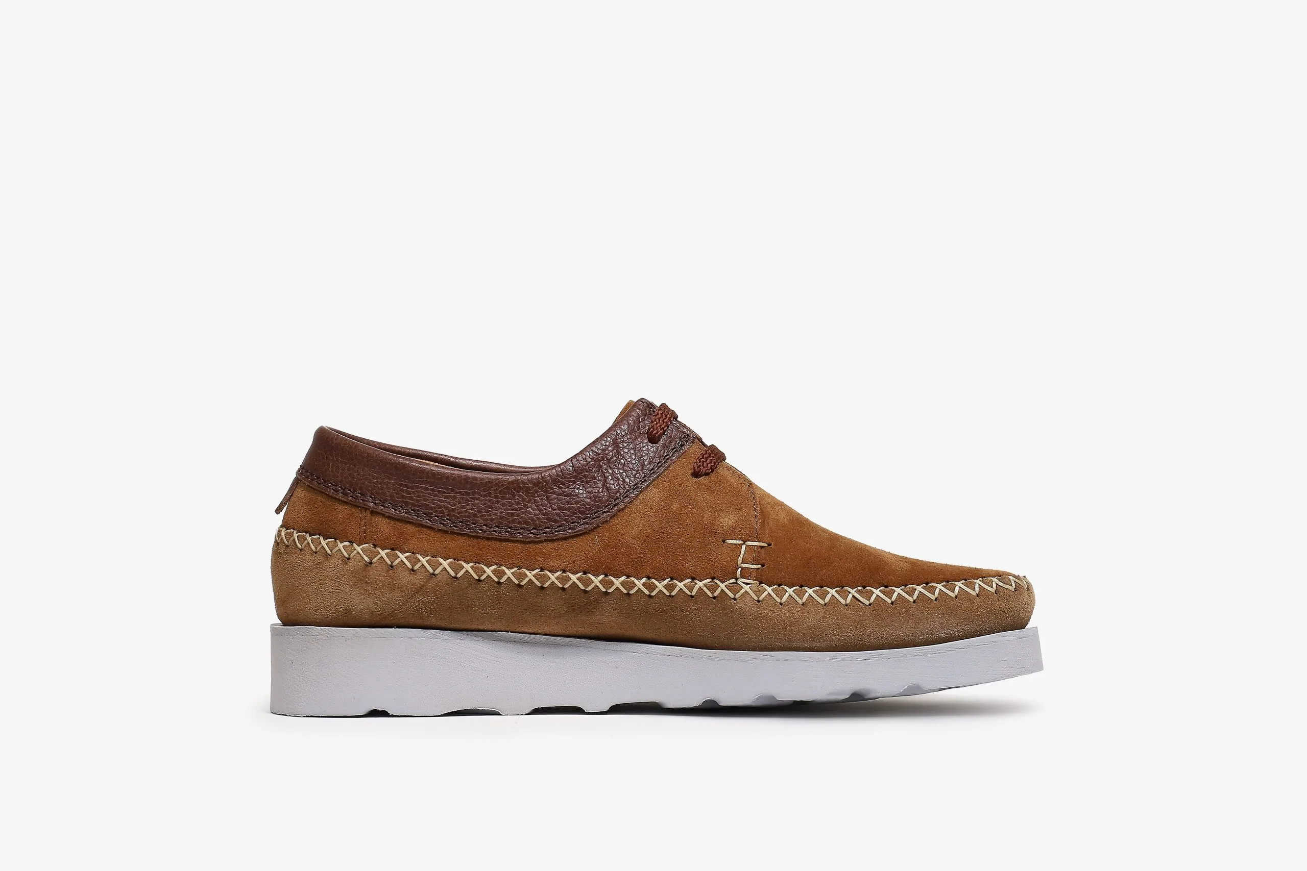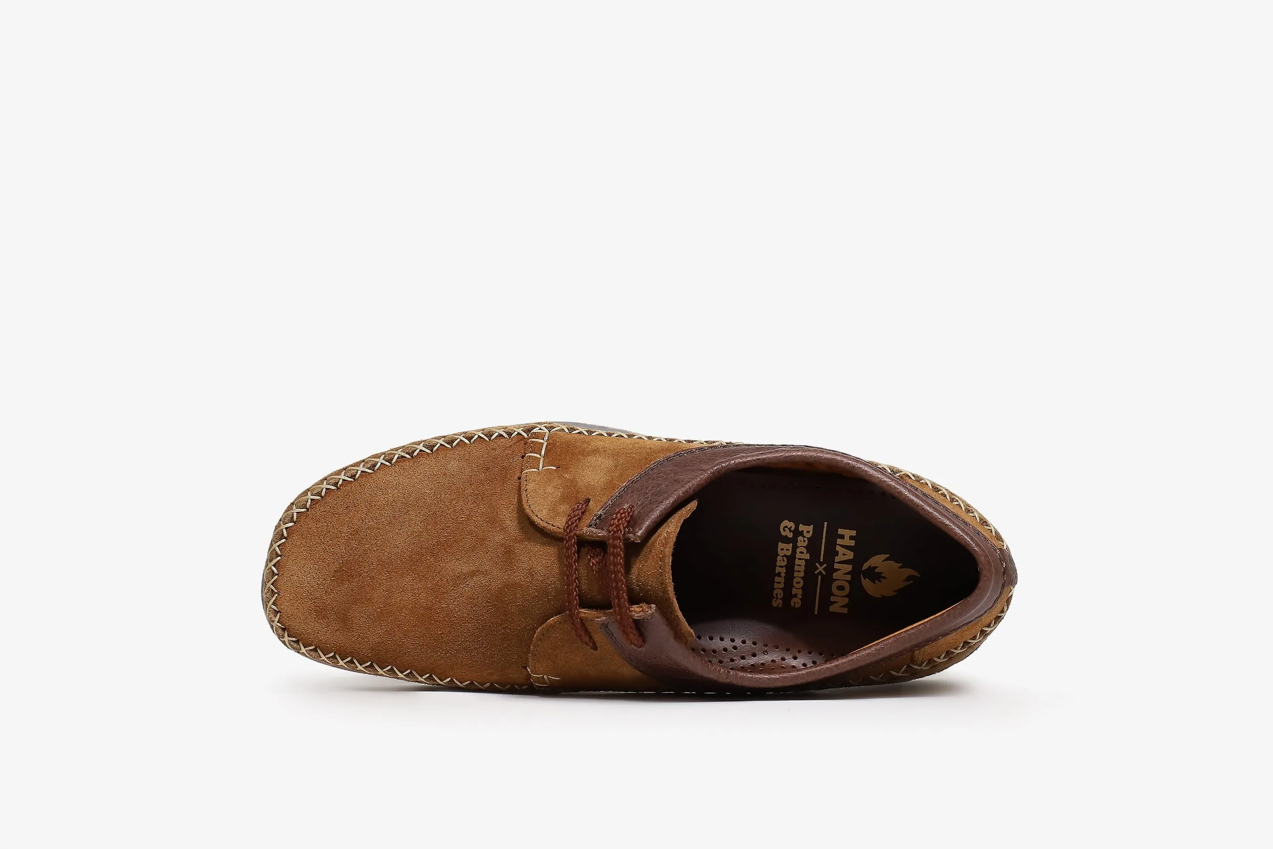HANON and the Original Padmore & Barnes present a collaborative sport-inspired make-up of the classic Willow – a style which we have updated with a performance VIBRAM sole unit. Produced on Padmoreâs Original nature form last with a moccasin-style construction, our version is hand-stitched in Portugal and constructed using the finest Italian velour suedes, contrasted with brownleather, and finished with a lush leather lining, screened gold foil HANON Flame logo at the heel, and a bespoke leather insole with our logo lock-up applied via gold foil detailing.