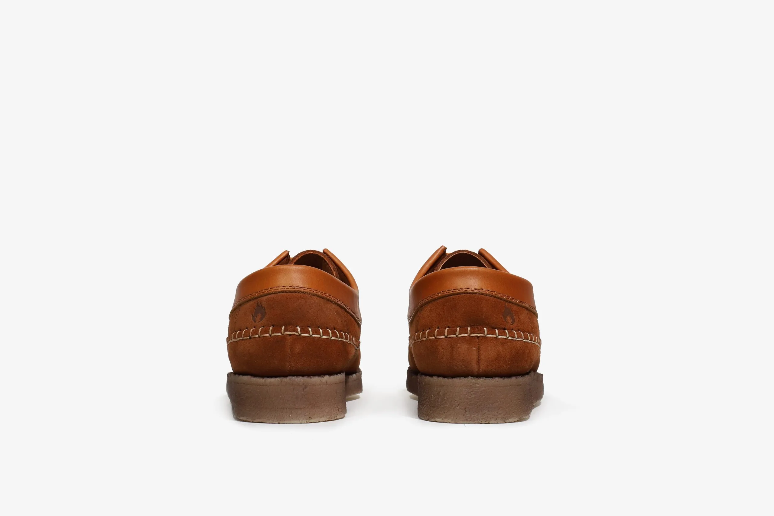 HANON and the Original Padmore & Barnes present a collaborative make-up of the classic Willow. Produced on Padmore’s Original nature form last with a moccasin-style construction, our version is hand-stitched in Portugal and constructed with shadow-sprayed No.1 plantation crepe, the finest Italian velour suedes, and contrasted with a leather collar. The shoe is finished with a lush leather lining, screened gold foil HANON Flame logo at the heel, and a bespoke leather insole with our logo lock-up applied via gold foil detailing.