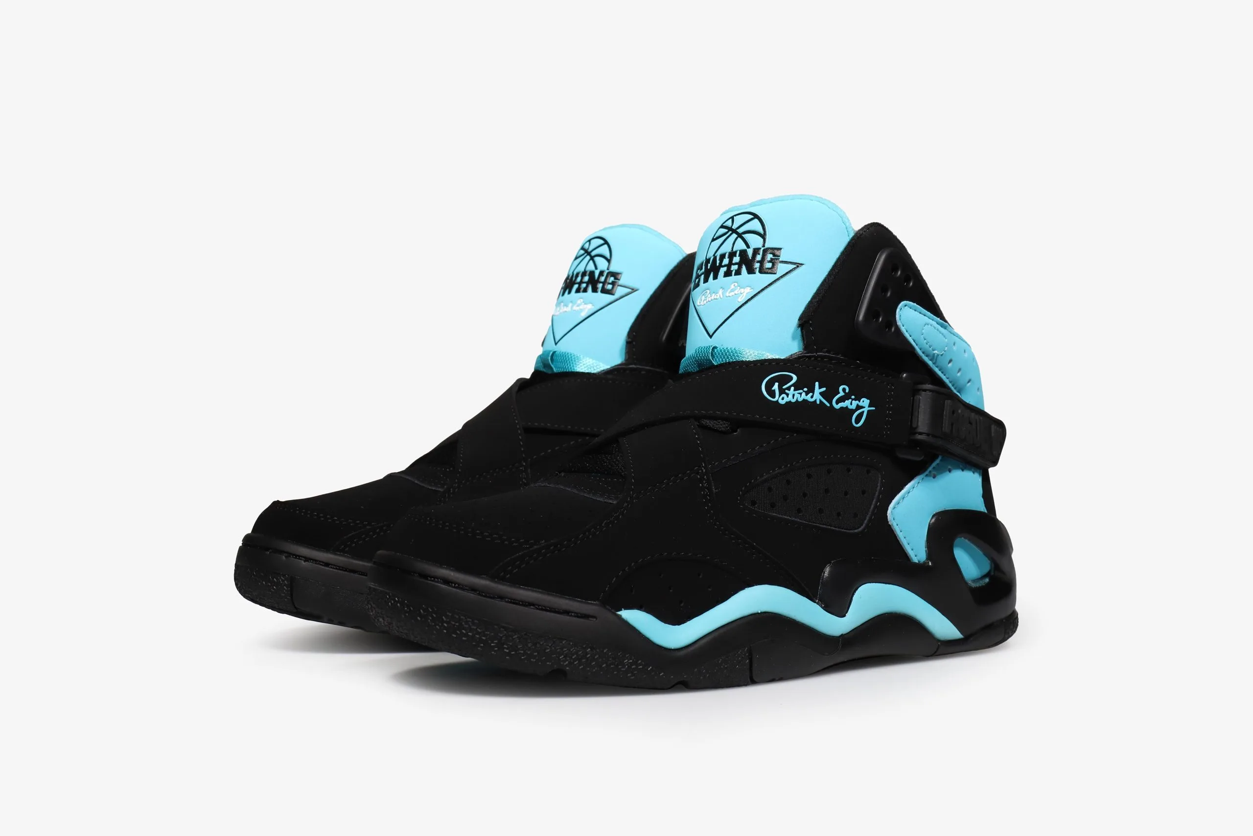 Back by popular demand, the Rouge was reintroduced to mark the brands return to the market. Keeping the foot secure in a unique forefoot strap, accompanied by a cushioned EVA midsole for comfort. This pair boasts lush suede overlays in a deep black, making the cyan blue accents stand out.Â